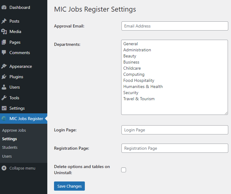 The plugin uses 3 shortcodes, one for Student Registration, one for Student Login and one for Adding Jobs.